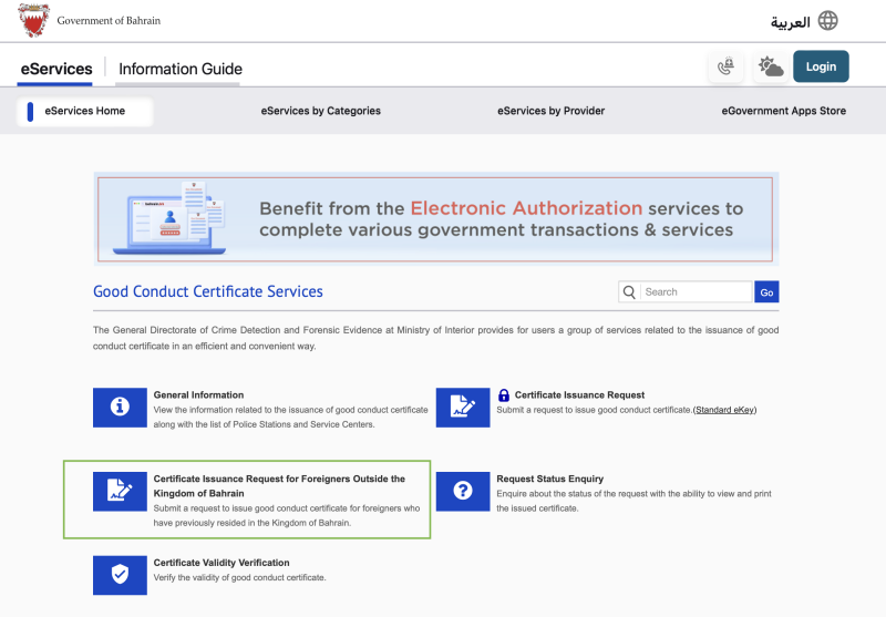 “Certificate Issuance Request for Foreigners Outside the Kingdom of Bahrain”